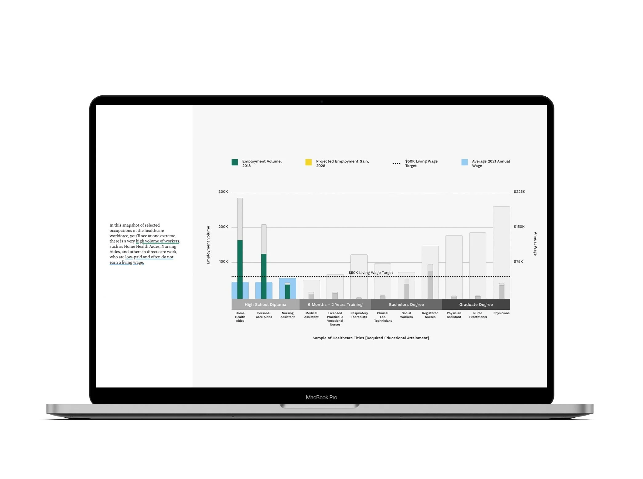 The most detailed chart in the anniversary report is the barbell chart (pg 15 in report). This chart depicts a key challenge in healthcare workforce development looking at number of low and high paying jobs, educational requirements, projected employment, and annual wages. Translating this chart for the website presented the opportunity to break this chart down. As you scroll through the infographic, specific elements of the chart are highlighted and further details are provided. This allows a reader to follow step-by-step and understand how each data piece informs the overall chart and story.